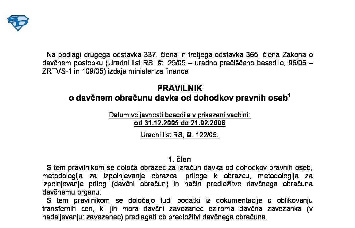 Čeprav je datum veljavnosti Pravilnika od 31.12.2005 naprej, se Pravilnik iz vsebinskega zornega kota uporablja za obračun DDPO, ki vključuje obdobje od 01.01.2005 dalje in je predložen do vključno 21.02.2006. Pravilnik je popravljen z objavo v UL RS z dne 21.02.2006. Priloga.pdf