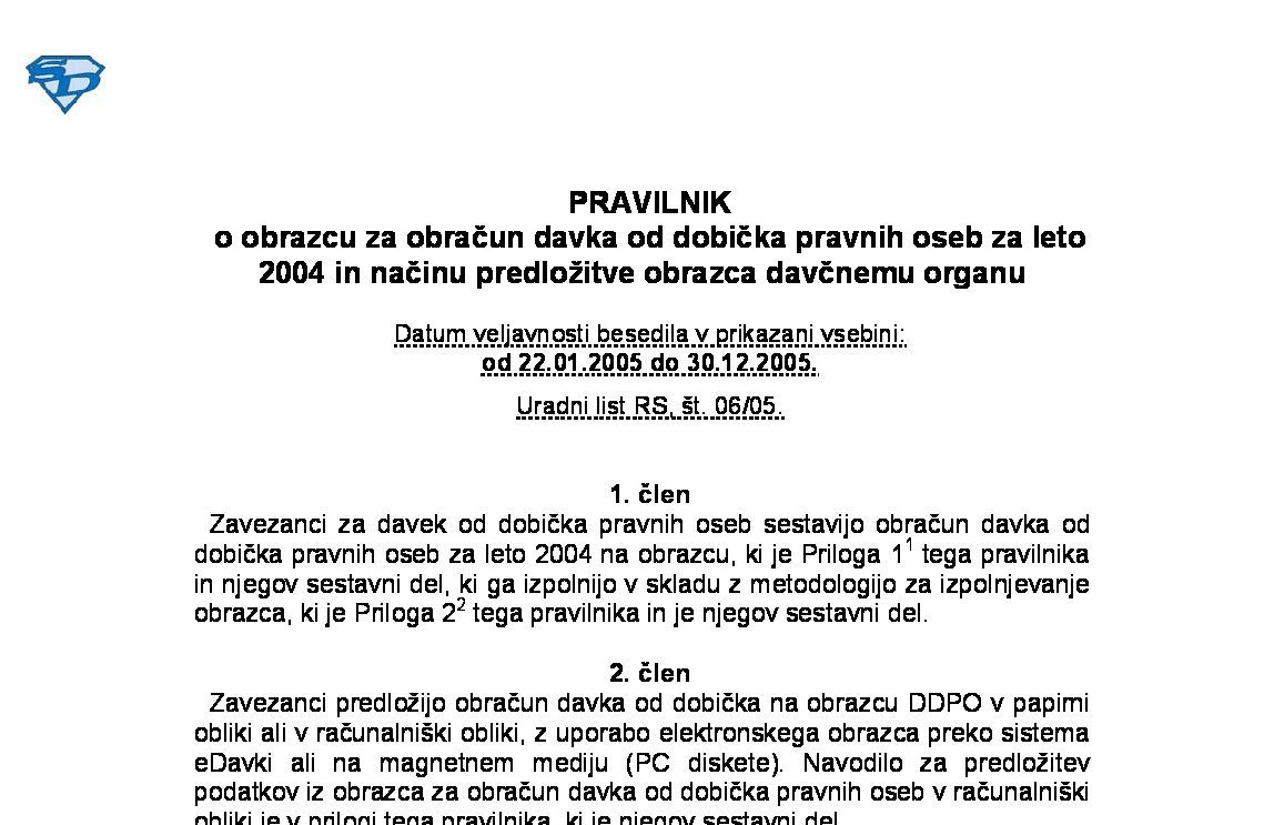 Čeprav je datum veljavnosti Pravilnika 22.01.2005, se Pravilnik iz vsebinskega zornega kota uporablja za obdobje od 01.01. do 31.12.2004. Zaradi zamude pri objavi obrazca davčnega obračuna, prilagojenega določbam ZDDPO-1, se je Pravilnik v praksi uporabljal do 30.12.2005. |