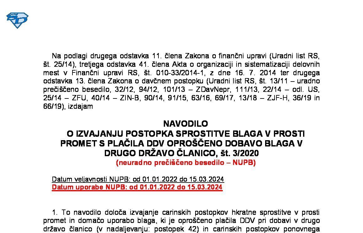 NAVODILO o izvajanju postopka sprostitve blaga v prosti promet s plačila DDV oproščeno dobavo blaga v drugo državo članico, št. 3/2020 01.09.2025 29.08.2025