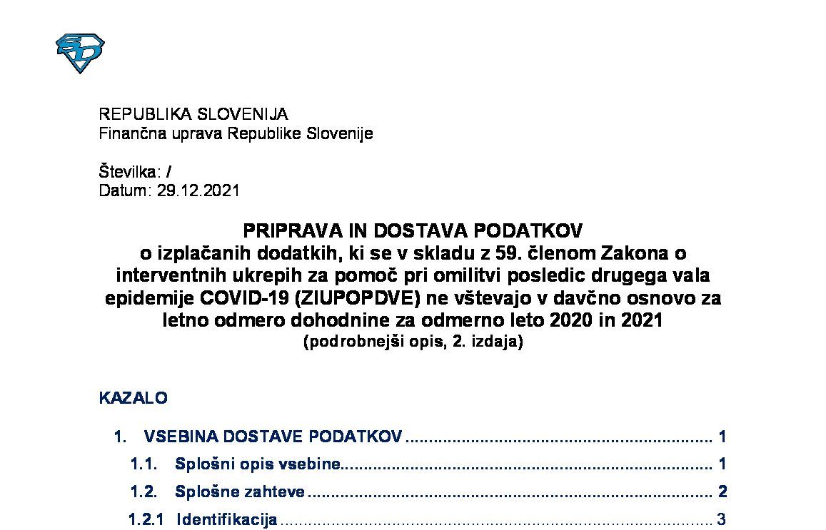 PRIPRAVA IN DOSTAVA PODATKOV o izplačanih dodatkih, ki se v skladu z 59. členom ZIUPOPDVE ter 55. členom ZDUPŠOP ne vštevajo v davčno osnovo za letno odmero dohodnine za odmerno leto 2021 (podrobnejši opis, 3. izdaja) 03.01.2022 05.01.2022