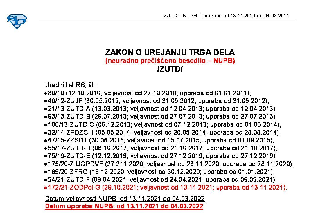 ZAKON O UREJANJU TRGA DELA (ZUTD - neuradno prečiščeno besedilo) 20.09.2025 [!] 28.10.2025 23.09.2025