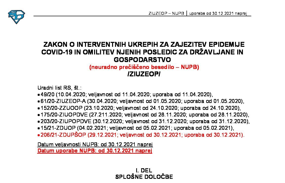 | ZAKON O INTERVENTNIH UKREPIH ZA POMOČ PRI OMILITVI POSLEDIC DRUGEGA VALA EPIDEMIJE COVID-19 (ZIUPOPDVE - neuradno prečiščeno besedilo) | 01.01.2023 | 30.12.2023 | 20.12.2022 | |