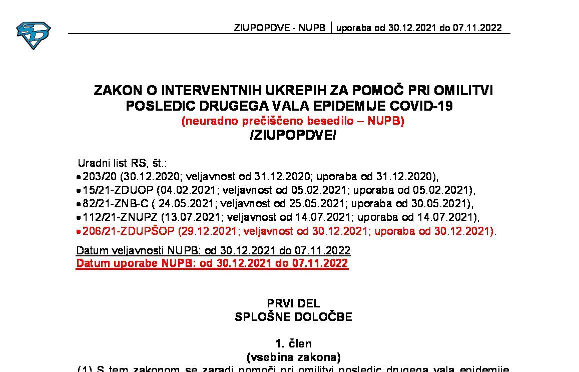 ZAKON O INTERVENTNIH UKREPIH ZA POMOČ PRI OMILITVI POSLEDIC DRUGEGA VALA EPIDEMIJE COVID-19 (ZIUPOPDVE - neuradno prečiščeno besedilo) 31.12.2023 16.02.2024