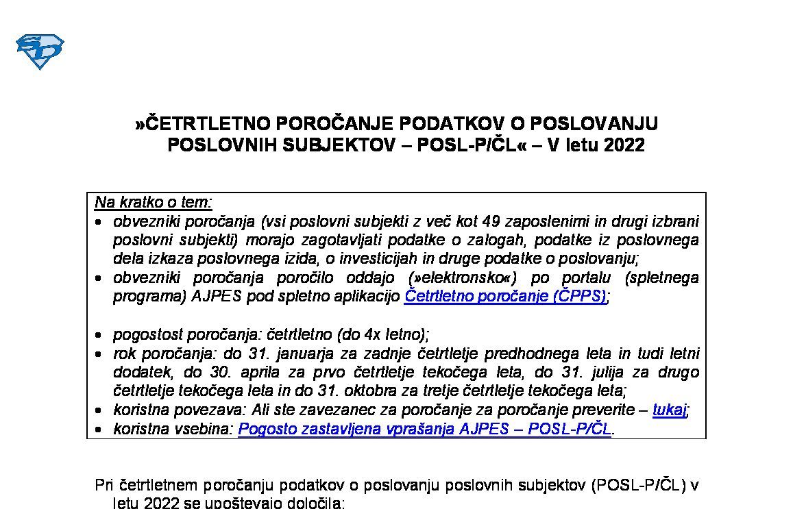 ČETRTLETNO POROČANJE PODATKOV O POSLOVANJU POSLOVNIH SUBJEKTOV - POSL-P/ČL - V letu 2025 10.01.2025