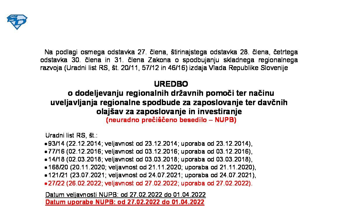 | Uredba o karti regionalne pomoči za obdobje 2022–2027 (NUPB - neuradno prečiščeno besedilo) | 15.04.2023 | 31.12.2027 | 17.04.2023 | |