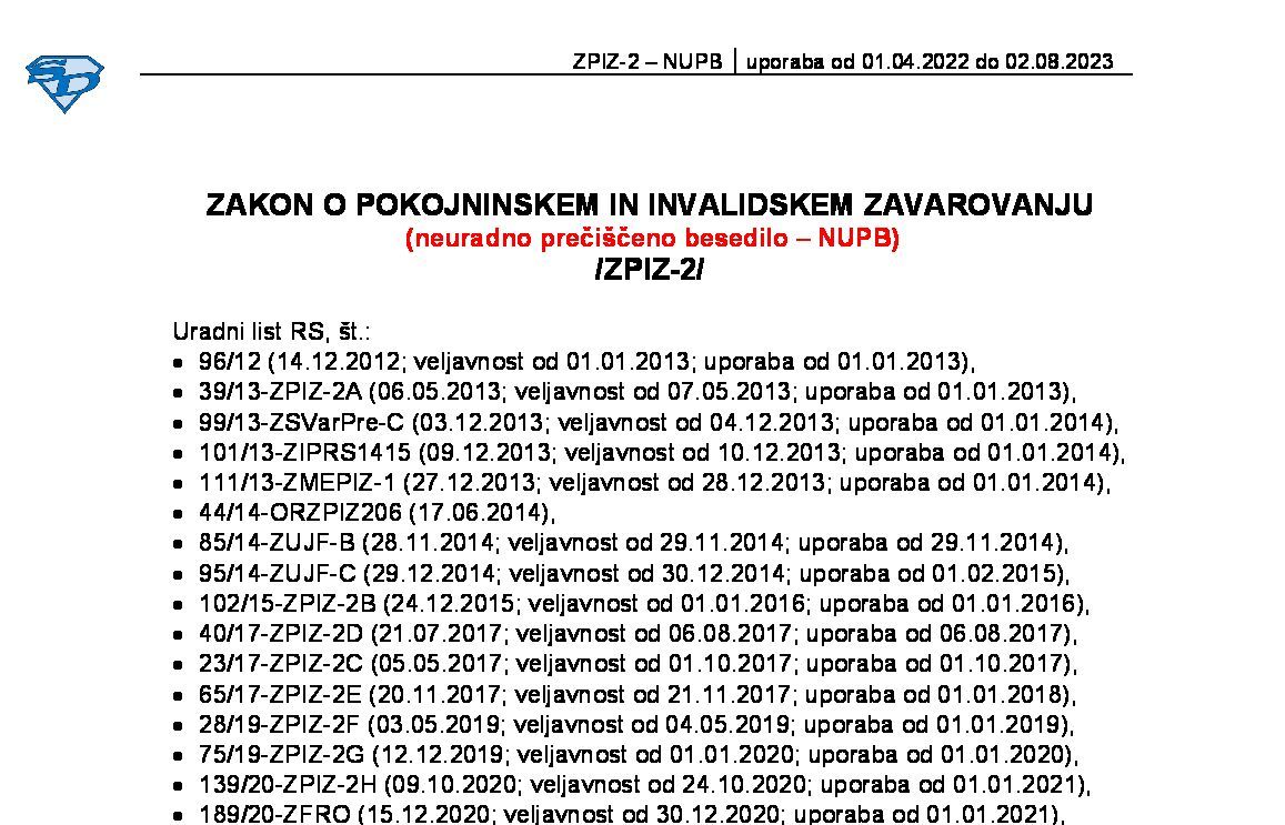 ZAKON O POKOJNINSKEM IN INVALIDSKEM ZAVAROVANJU (ZPIZ-2- neuradno prečiščeno besedilo) 03.08.2023 31.12.2023 17.08.2023