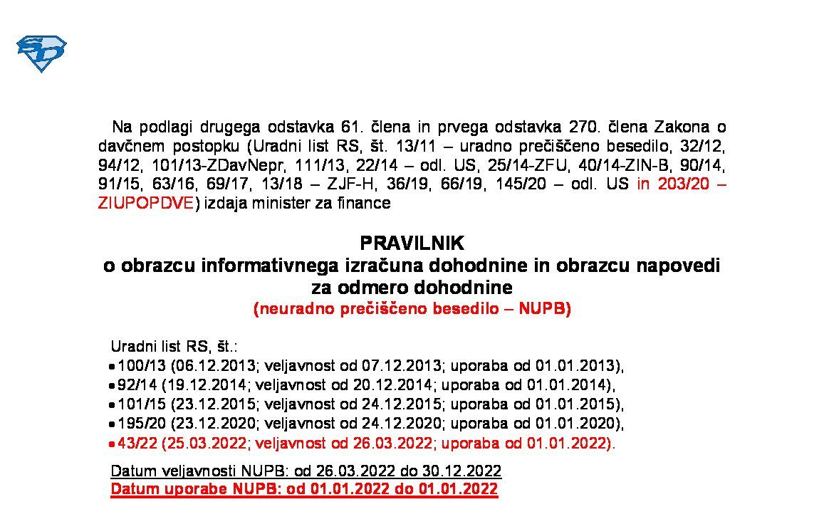 | Pravilnik o dostavi podatkov za odmero dohodnine ('dostava-obdavčljivi dohodki' - neuradno prečiščeno besedilo) | 01.01.2025 | [!] | 26.11.2025 | |