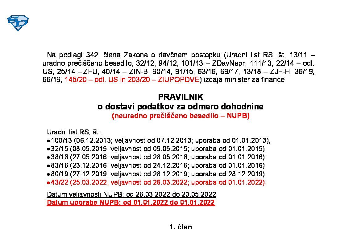 | Pravilnik o dostavi podatkov za odmero dohodnine ('dostava-obdavčljivi dohodki' - neuradno prečiščeno besedilo) | 01.01.2025 | [!] | 26.11.2025 | |