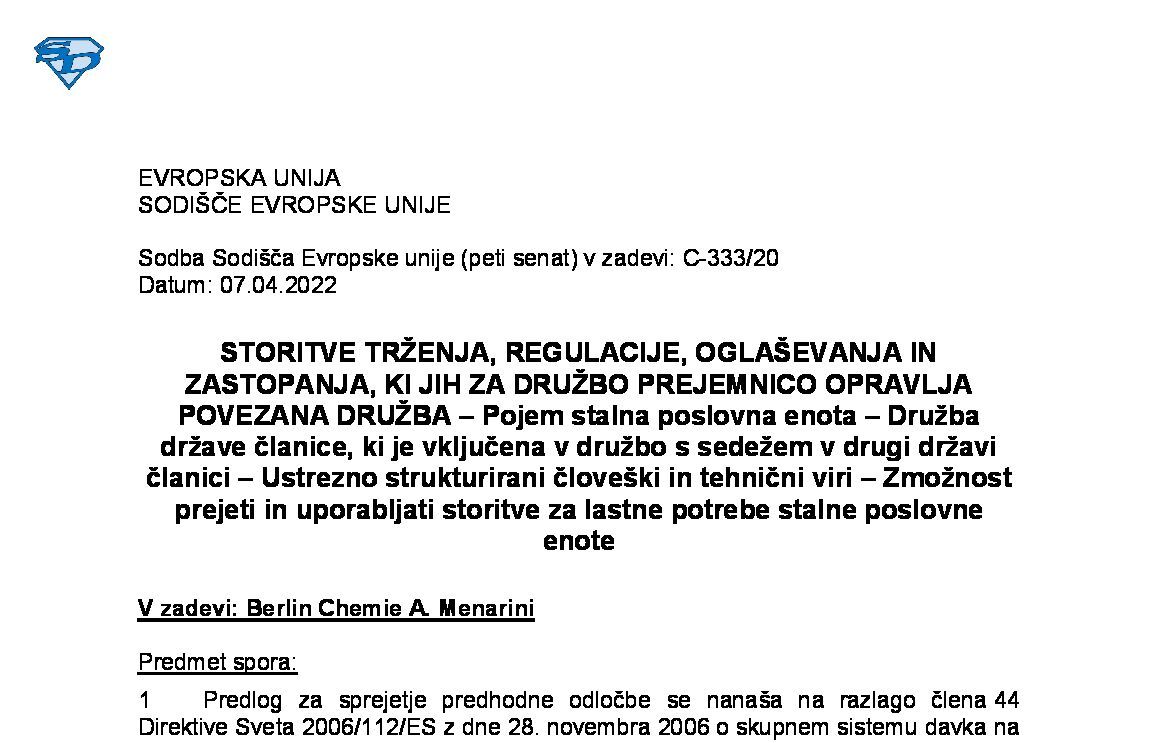 VRAČILO DDV DAVČNIM ZAVEZANCEM, KI NIMAJO SEDEŽA V DRŽAVI ČLANICI VRAČILA – GLAVNA IN POMOŽNA STORITEV – UMETNA DELITEV ENOTNE STORITVE – Neobstoj premestitve predmeta dobave (C-234/24) 23.10.2025 24.10.2025