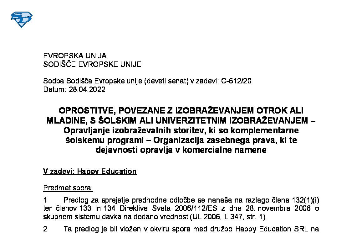 BREZPLAČNA PRAVNA POMOČ, KI JO ODVETNIK ZAGOTOVI STRANKI V SODNEM POSTOPKU – PLAČILO NAGRADE TEGA ODVETNIKA S STRANI PORAŽENE NASPROTNE STRANKE – Transakcije, ki so predmet DDV – Opravljanje storitev za plačilo (C-744/23) 23.10.2025 29.10.2025