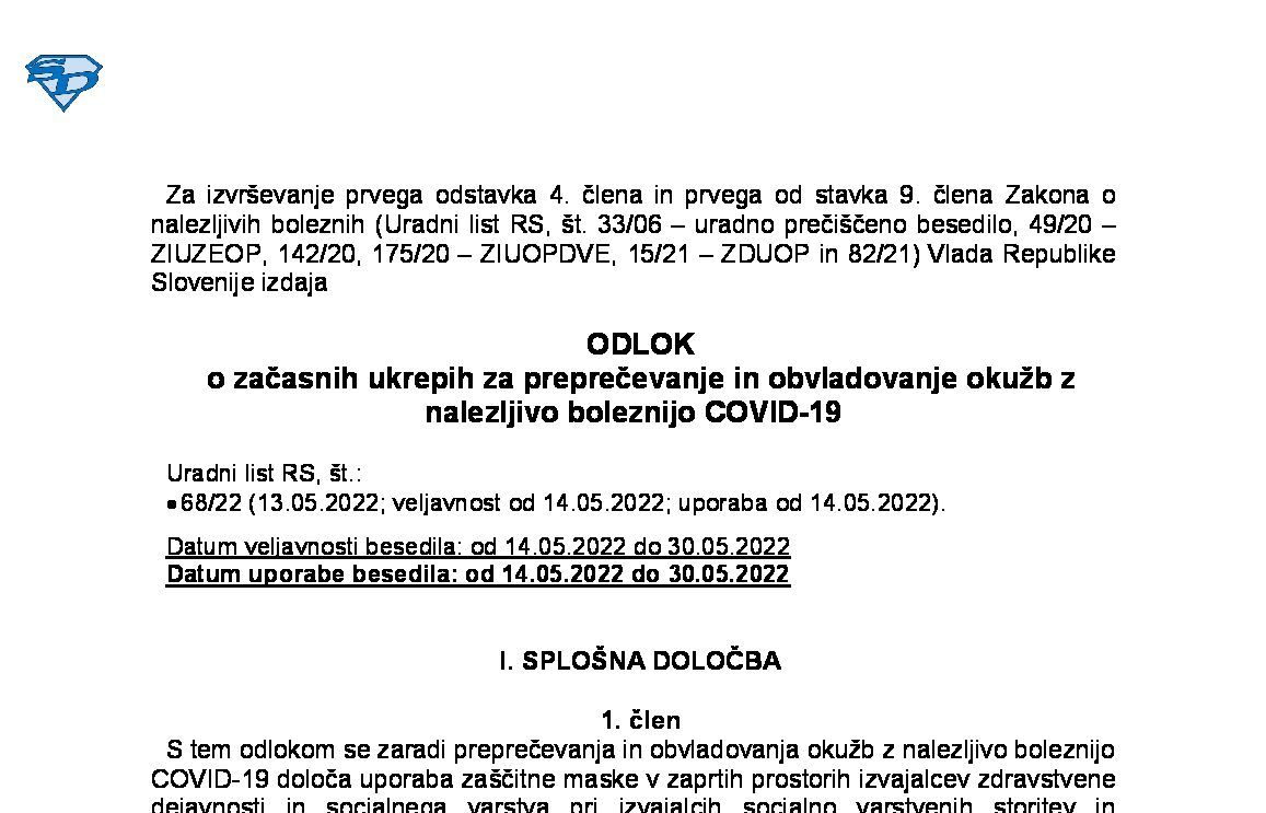 Odlok o začasnih ukrepih pri izvajanju OBVEZNEGA ZDRAVSTVENEGA ZAVAROVANJA zaradi zajezitve in obvladovanja epidemije COVID-19 25.03.2020 07.05.2020 25.03.2020