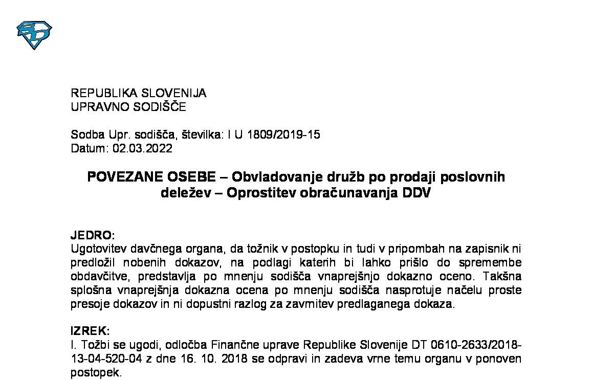 IZPOLNJEVANJE POGOJEV ZA DOBAVO BLAGA ZNOTRAJ UNIJE, OPROŠČENO PLAČILA DDV NA PODLAGI 46. ČLENA ZDDV-1 – Nepopolne CMR listine (I U 1704/2021-38) 27.11.2024 15.10.2025