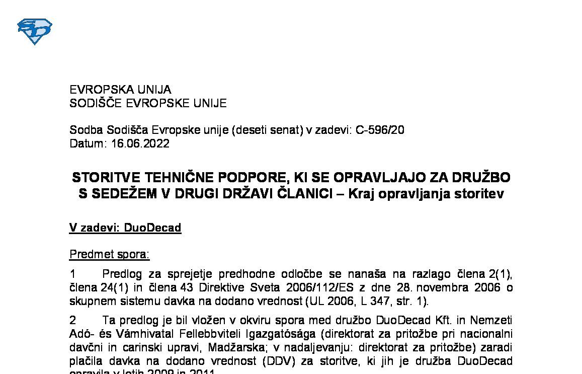VRAČILO DDV DAVČNIM ZAVEZANCEM, KI NIMAJO SEDEŽA V DRŽAVI ČLANICI VRAČILA – GLAVNA IN POMOŽNA STORITEV – UMETNA DELITEV ENOTNE STORITVE – Neobstoj premestitve predmeta dobave (C-234/24) 23.10.2025 24.10.2025