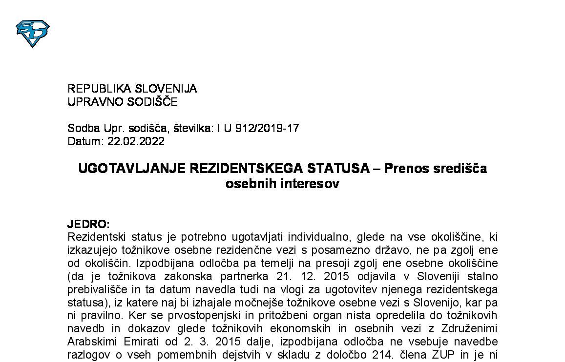 UGOTAVLJANJE REZIDENTSKEGA STATUSA – Dvojno rezidentstvo – Rezidentstvo po KIDO in po ZDoh-2 ( I U 609/2021-7) 17.05.2024 10.06.2025