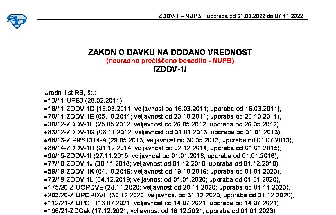 ZAKON O DAVKU NA DODANO VREDNOST (ZDDV-1 - neuradno prečiščeno besedilo) 06.12.2023 [!] 31.12.2023 05.12.2023
