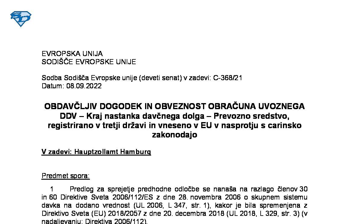 VRAČILO DDV DAVČNIM ZAVEZANCEM, KI NIMAJO SEDEŽA V DRŽAVI ČLANICI VRAČILA – GLAVNA IN POMOŽNA STORITEV – UMETNA DELITEV ENOTNE STORITVE – Neobstoj premestitve predmeta dobave (C-234/24) 23.10.2025 24.10.2025