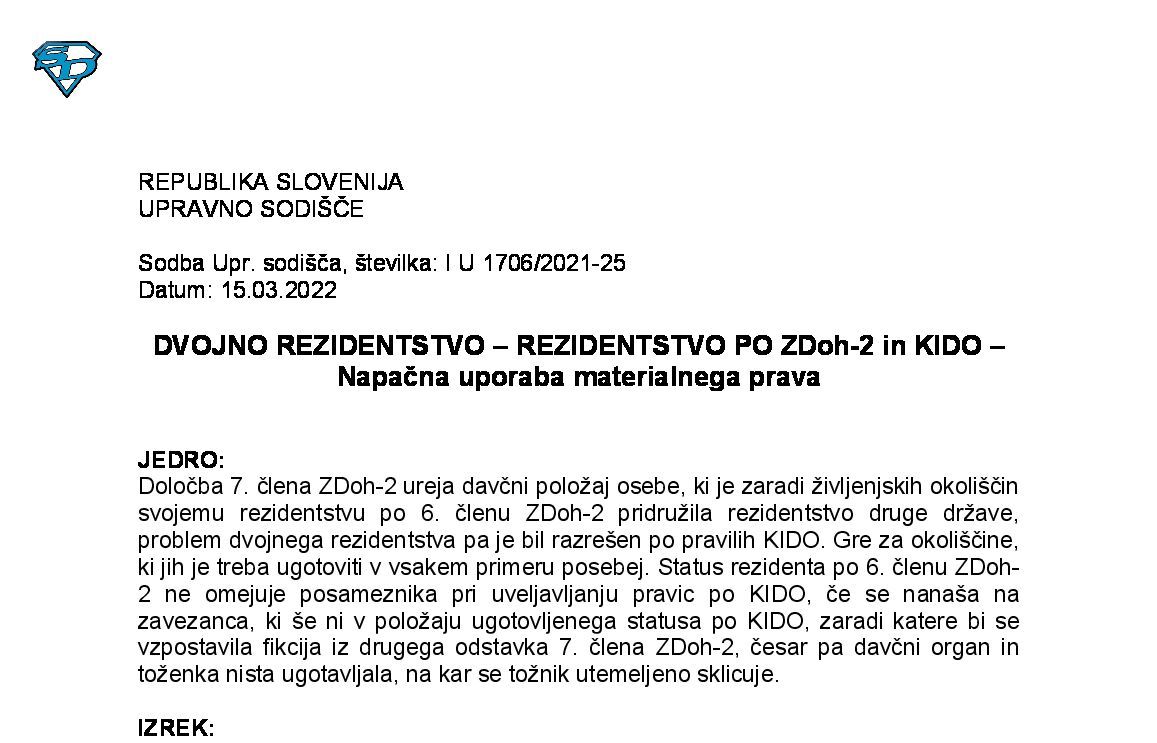 UGOTAVLJANJE REZIDENTSKEGA STATUSA – Dvojno rezidentstvo – Rezidentstvo po KIDO in po ZDoh-2 ( I U 609/2021-7) 17.05.2024 10.06.2025