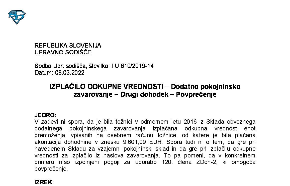 PREJEM POSLOVNEGA DELEŽA V DRUŽBI OB ANGAŽIRANJU PRI SANACIJI DRUŽBE – Darilo, ki se obdavčuje po ZDDD, ali dohodek obdavčen po ZDoh-2 (I U 1495/2022-13) 20.11.2024 10.07.2025