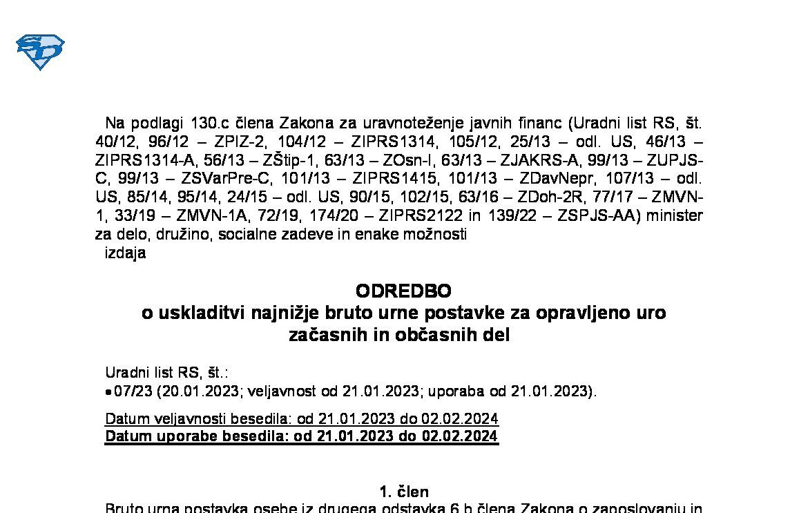 Odredba o uskladitvi najnižje bruto urne postavke za opravljeno uro začasnih in občasnih del 03.10.2023 05.02.2024