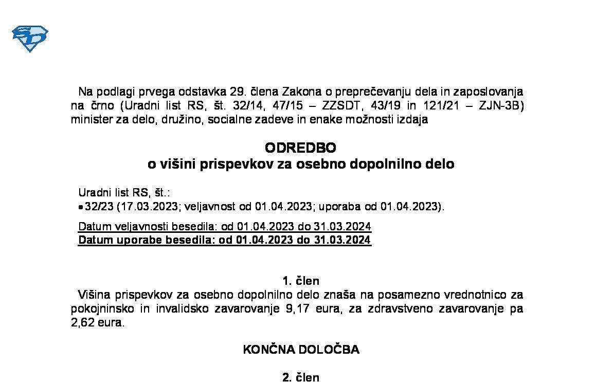 Odredba o višini prispevkov za osebno dopolnilno delo 01.04.2025 14.03.2025