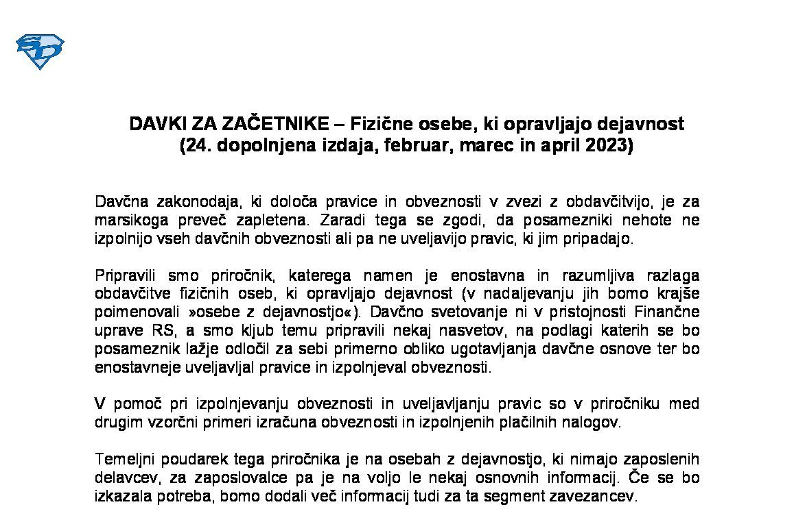 Članek nima posebnosti! DAVKI ZA ZAČETNIKE - Fizične osebe, ki opravljajo dejavnost (24. dopolnjena izdaja, februar in marec 2023).pdf