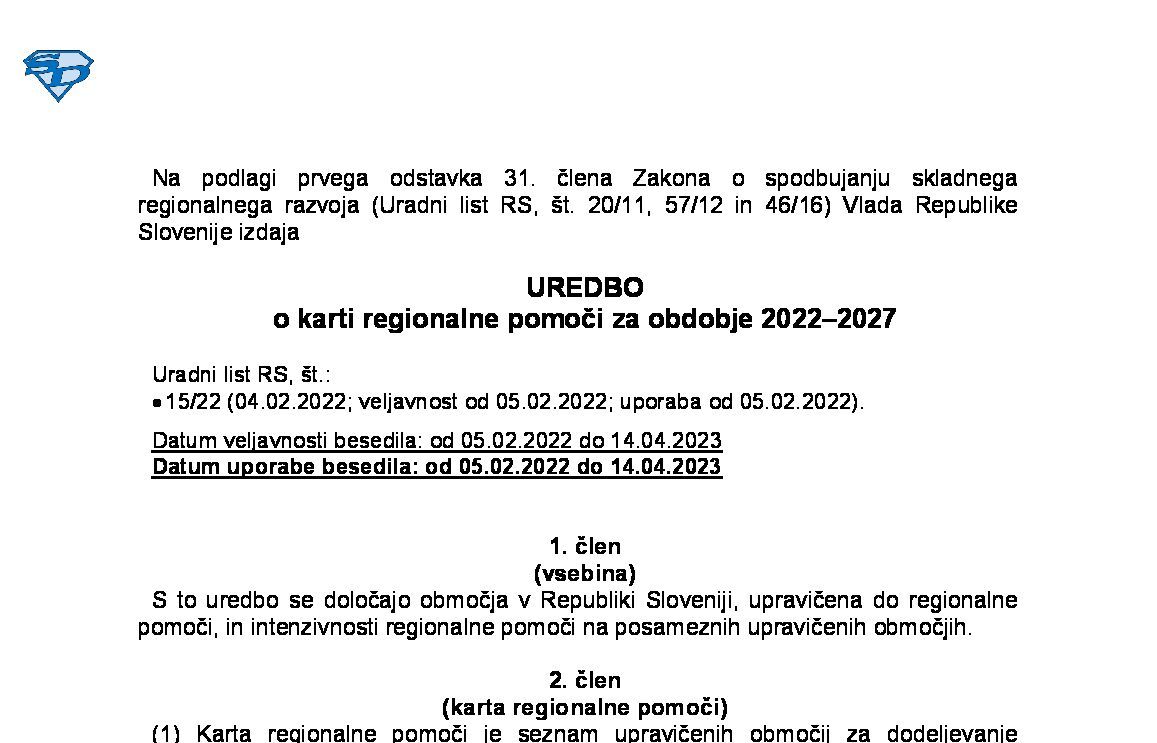 Uredba o karti regionalne pomoči za obdobje 2022–2027 (NUPB - neuradno prečiščeno besedilo) 15.04.2023 31.12.2027 17.04.2023