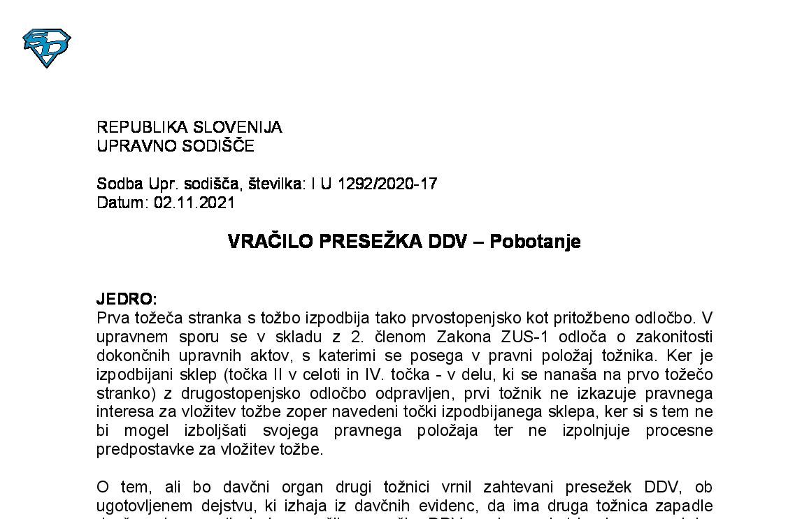 IZPOLNJEVANJE POGOJEV ZA DOBAVO BLAGA ZNOTRAJ UNIJE, OPROŠČENO PLAČILA DDV NA PODLAGI 46. ČLENA ZDDV-1 – Nepopolne CMR listine (I U 1704/2021-38) 27.11.2024 15.10.2025