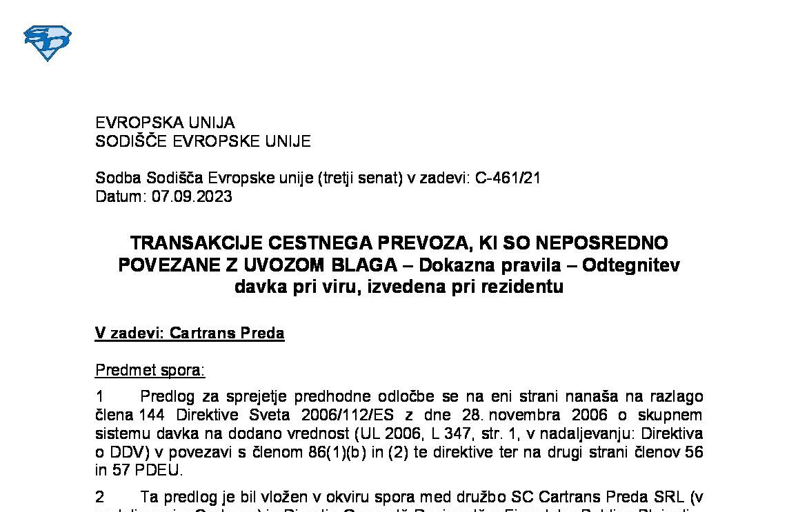 POJEM OPRAVLJANJE STORITEV ZA PLAČILO – KOMERCIALNE STORITVE, KI SE OPRAVLJAJO ZNOTRAJ ISTE SKUPINE DRUŽB – Transferna cena – Pravica do odbitka DDV (C-726/23) 04.09.2025 05.09.2025