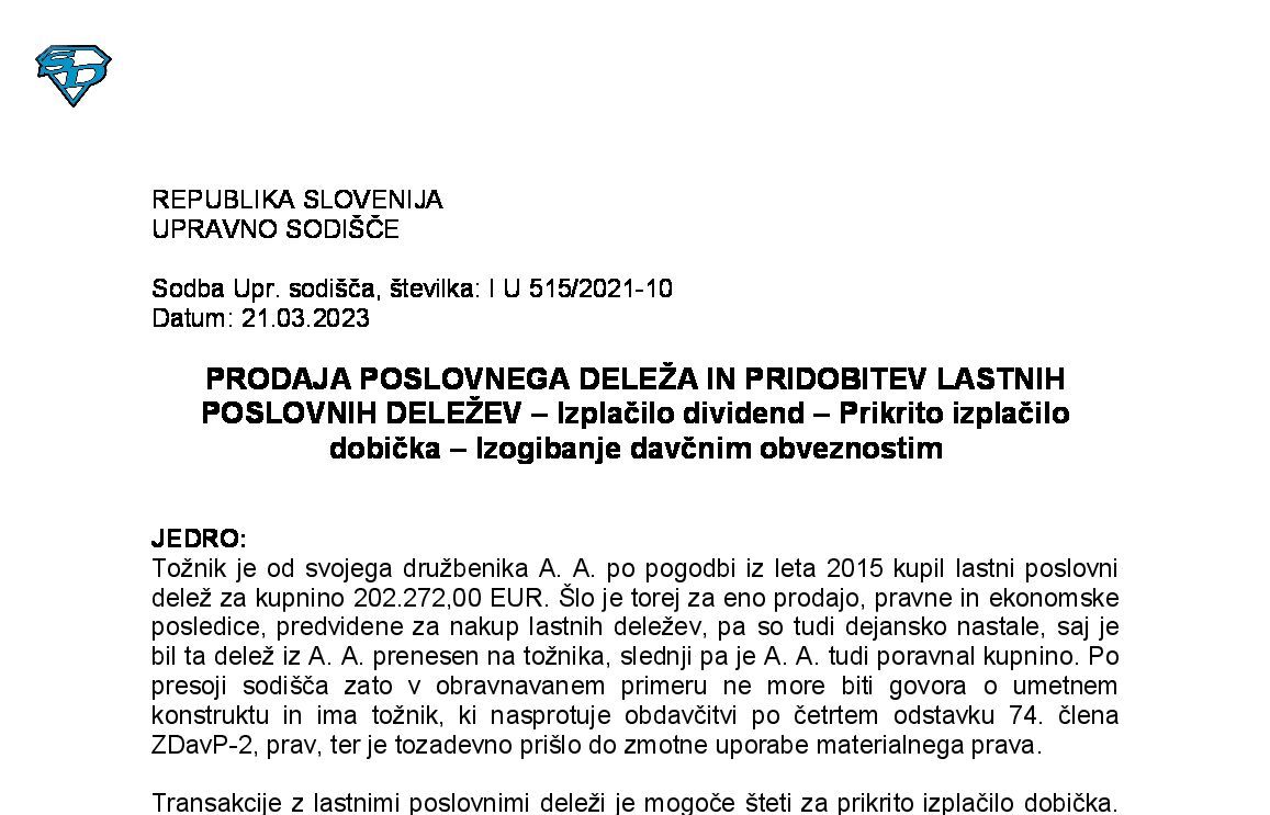 PREJEM POSLOVNEGA DELEŽA V DRUŽBI OB ANGAŽIRANJU PRI SANACIJI DRUŽBE – Darilo, ki se obdavčuje po ZDDD, ali dohodek obdavčen po ZDoh-2 (I U 1495/2022-13) 20.11.2024 10.07.2025