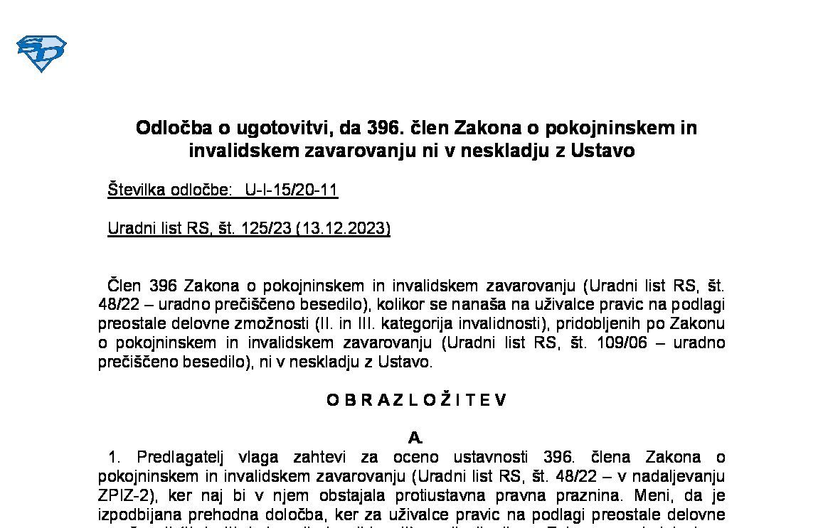 Odločba Ustavnega sodišča - 396. člen ZPIZ-2 (13.12.2023) 23.11.2023 15.12.2023