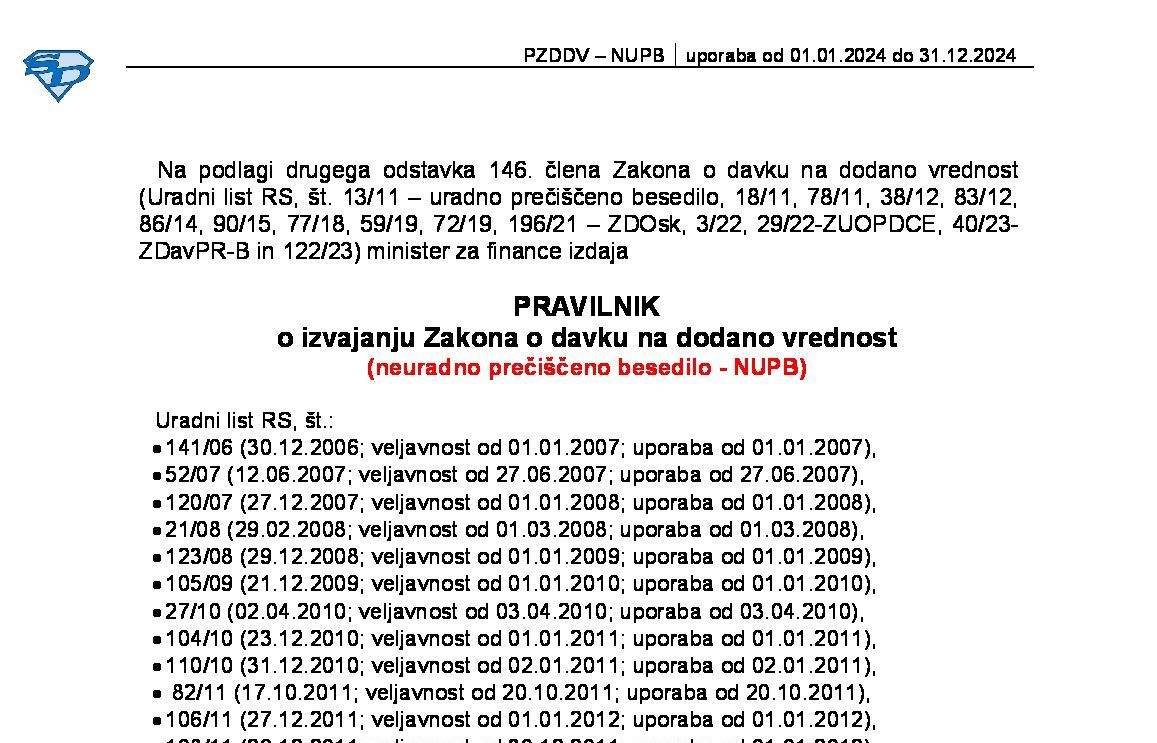 Pravilnik o izvajanju Zakona o davku na dodano vrednost (PZDDV - neuradno prečiščeno besedilo) 01.01.2025 [!] 30.12.2024