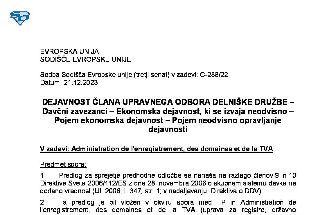 BREZPLAČNA PRAVNA POMOČ, KI JO ODVETNIK ZAGOTOVI STRANKI V SODNEM POSTOPKU – PLAČILO NAGRADE TEGA ODVETNIKA S STRANI PORAŽENE NASPROTNE STRANKE – Transakcije, ki so predmet DDV – Opravljanje storitev za plačilo (C-744/23) 23.10.2025 29.10.2025