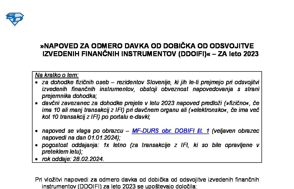DOSTAVA PODATKOV POTREBNIH ZA ODMERO DAVKA OD DOBIČKA OD ODSVOJITVE IZVEDENIH FINANČNIH INSTRUMENTOV (DDOIFI) - ZA leto 2024 28.01.2025