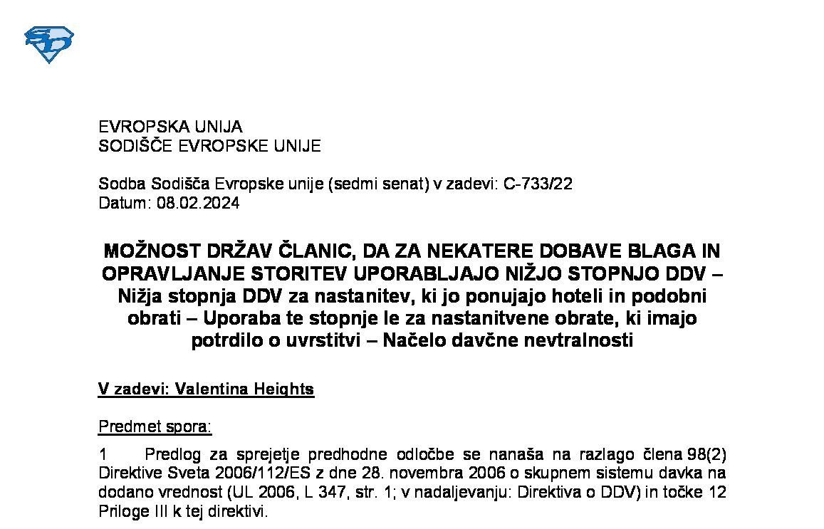 VRAČILO DDV DAVČNIM ZAVEZANCEM, KI NIMAJO SEDEŽA V DRŽAVI ČLANICI VRAČILA – GLAVNA IN POMOŽNA STORITEV – UMETNA DELITEV ENOTNE STORITVE – Neobstoj premestitve predmeta dobave (C-234/24) 23.10.2025 24.10.2025