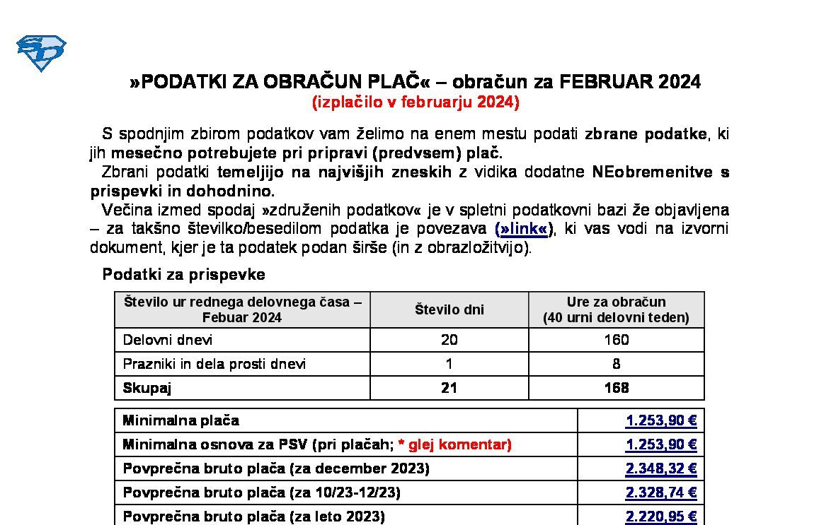 Skladno z dvigom minimalne plače (MP), MP za delo od januarja 2024 dalje za polni delovni čas ne more biti nižja od 1.253,90 €, kar je tudi (najnižji) znesek osnove za obračun prispevkov.