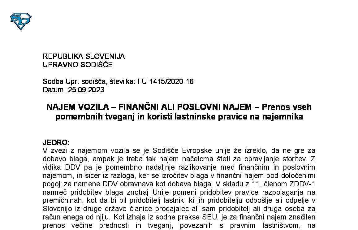 FINANČNI LIZING NEPREMIČNIN – Odstop od pogodb zaradi neizpolnjevanja obveznosti ter vračilo predmeta lizinga – Izdani dobropisi ter popravek izstopnega DDV (I U 44/2020-12) 21.03.2023 07.09.2023