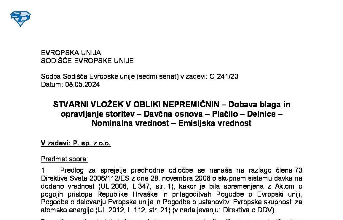 VRAČILO DDV DAVČNIM ZAVEZANCEM, KI NIMAJO SEDEŽA V DRŽAVI ČLANICI VRAČILA – GLAVNA IN POMOŽNA STORITEV – UMETNA DELITEV ENOTNE STORITVE – Neobstoj premestitve predmeta dobave (C-234/24) 23.10.2025 24.10.2025