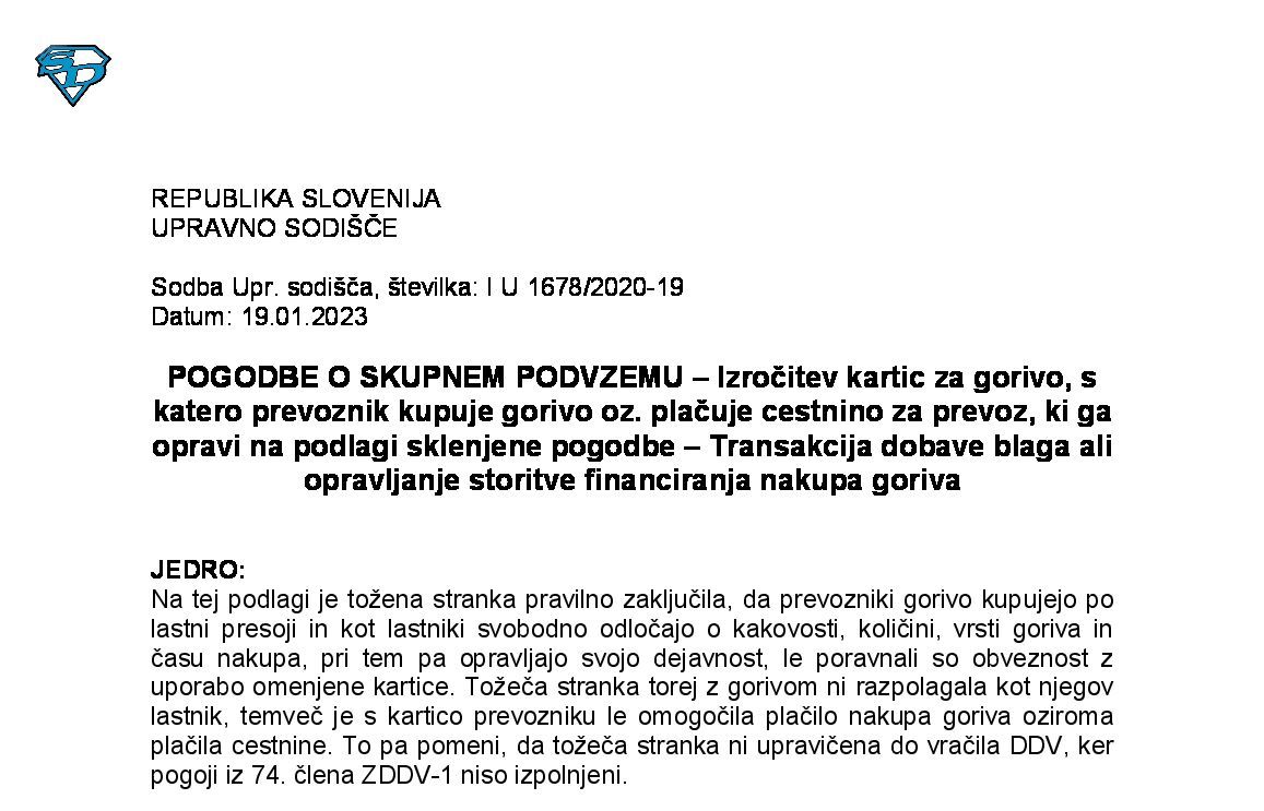 IZPOLNJEVANJE POGOJEV ZA DOBAVO BLAGA ZNOTRAJ UNIJE, OPROŠČENO PLAČILA DDV NA PODLAGI 46. ČLENA ZDDV-1 – Nepopolne CMR listine (I U 1704/2021-38) 27.11.2024 15.10.2025