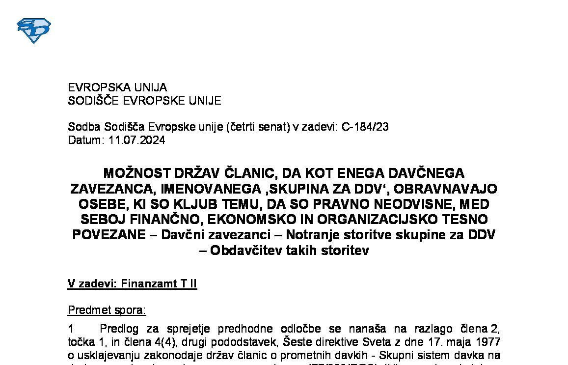 POSEBNA UREDITEV ZA MALA PODJETJA – Letni promet – Različno obravnavanje davčnih zavezancev – Nacionalna ureditev, s katero se oseba obdavči z DDV v primeru prepozne vložitve prijave za registracijo – Kaznovalna narava (C-122/23) 11.04.2024 12.04.2024