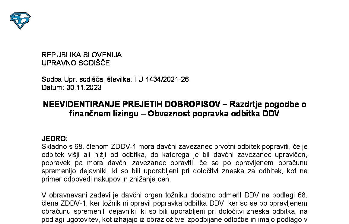 IZPOLNJEVANJE POGOJEV ZA DOBAVO BLAGA ZNOTRAJ UNIJE, OPROŠČENO PLAČILA DDV NA PODLAGI 46. ČLENA ZDDV-1 – Nepopolne CMR listine (I U 1704/2021-38) 27.11.2024 15.10.2025