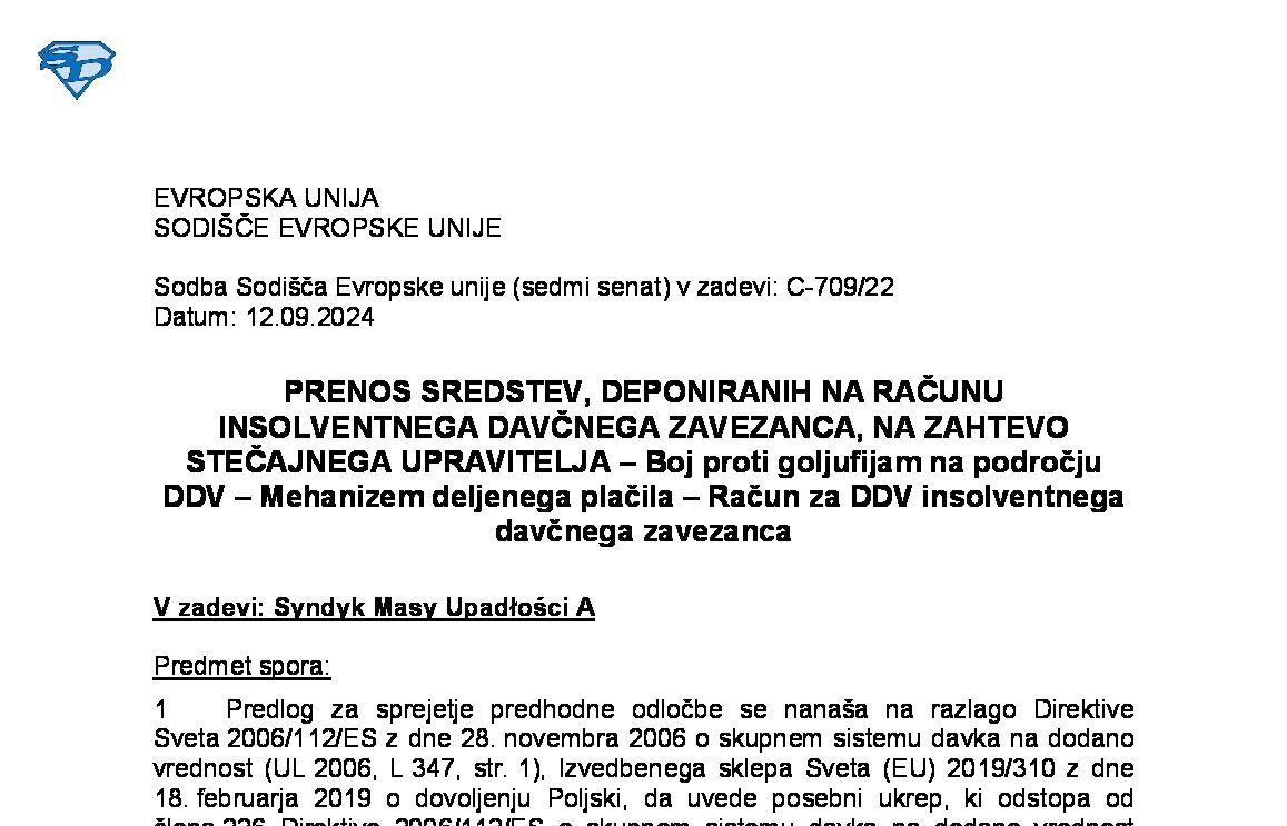 STORITVE STEČAJNIH IN LIKVIDACIJSKIH UPRAVITELJEV – Storitve, ki se opravljajo nepretrgano – Odbitek vstopnega DDV – Izdatki v zvezi s pravico do uporabe trgovskega imena (C-696/22) 13.06.2024 18.06.2024