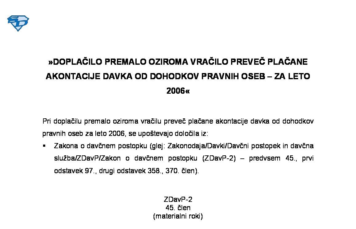 DOPLAČILO PREMALO OZIROMA VRAČILO PREVEČ PLAČANE AKONTACIJE DAVKA OD DOHODKOV PRAVNIH OSEB (DDPO) - za leto 2024 03.12.2024