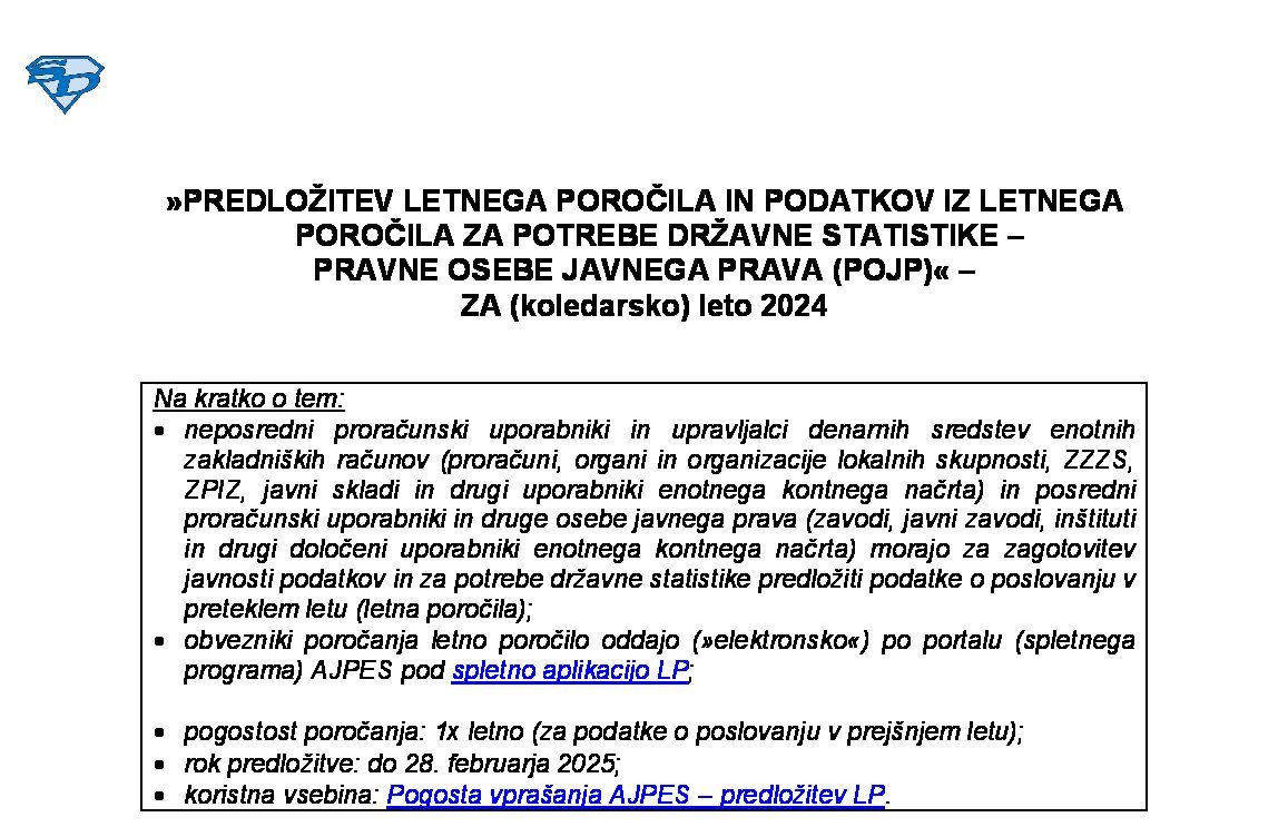 PREDLOŽITEV LETNEGA POROČILA IN PODATKOV IZ LETNEGA POROČILA ZA POTREBE DRŽAVNE STATISTIKE – PRAVNE OSEBE ZASEBNEGA PRAVA (POZP) - ZA (koledarsko) leto 2024 30.01.2025
