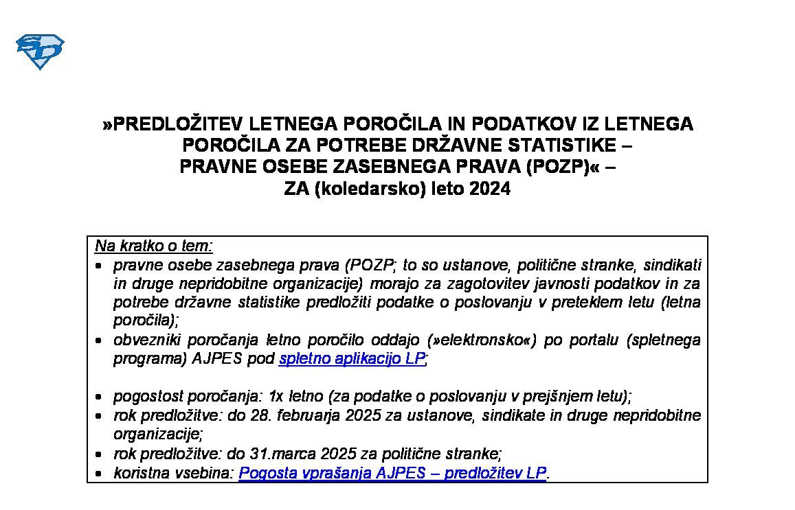 PREDLOŽITEV LETNEGA POROČILA IN PODATKOV IZ LETNEGA POROČILA ZA POTREBE DRŽAVNE STATISTIKE – PRAVNE OSEBE JAVNEGA PRAVA (POJP) - ZA (koledarsko) leto 2024 30.01.2025