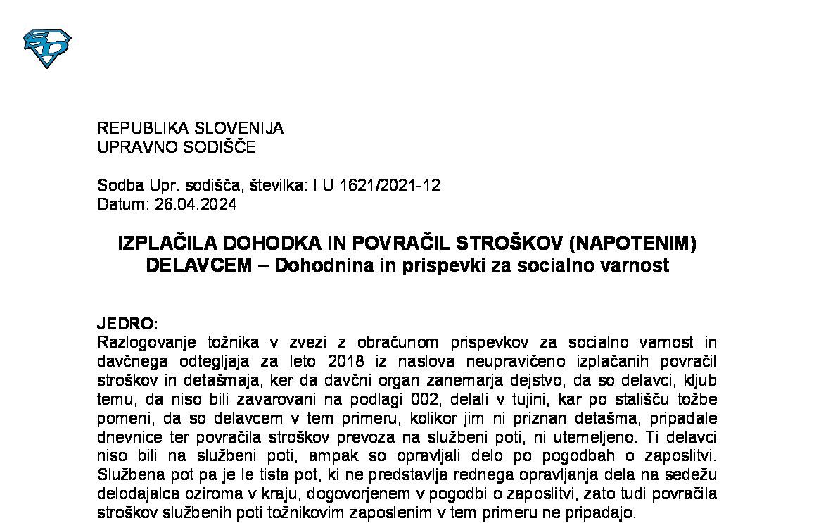 ODMERA DOHODNINE OD DOHODKA ZA DELO V TUJINI – Dokazovanje dejanske dnevne prisotnosti za delo v tujini (II U 115/2023-16) 19.02.2025 04.11.2025