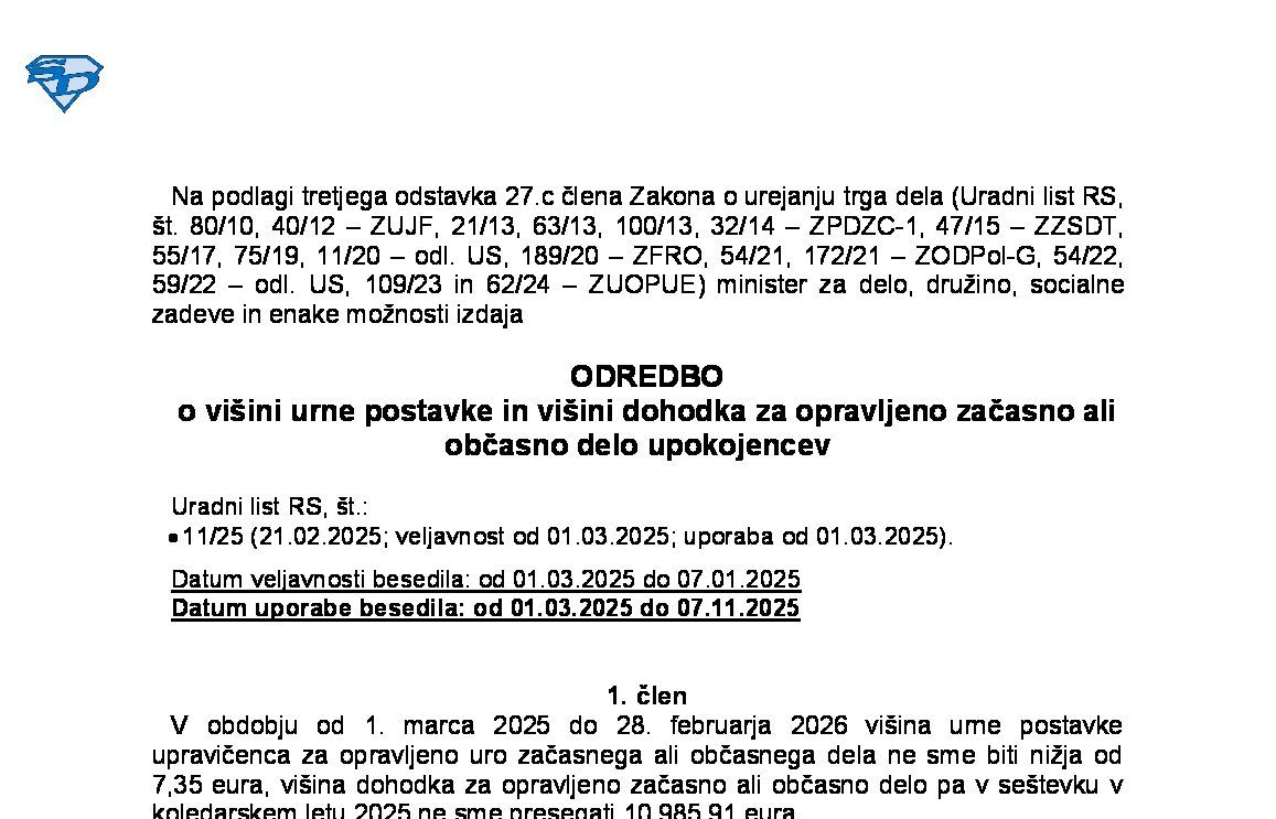 Odredba o višini urne postavke in višini dohodka za opravljeno začasno ali občasno delo upokojencev (NUPB - neuradno prečiščeno besedilo) 08.11.2025 28.02.2026 10.11.2025