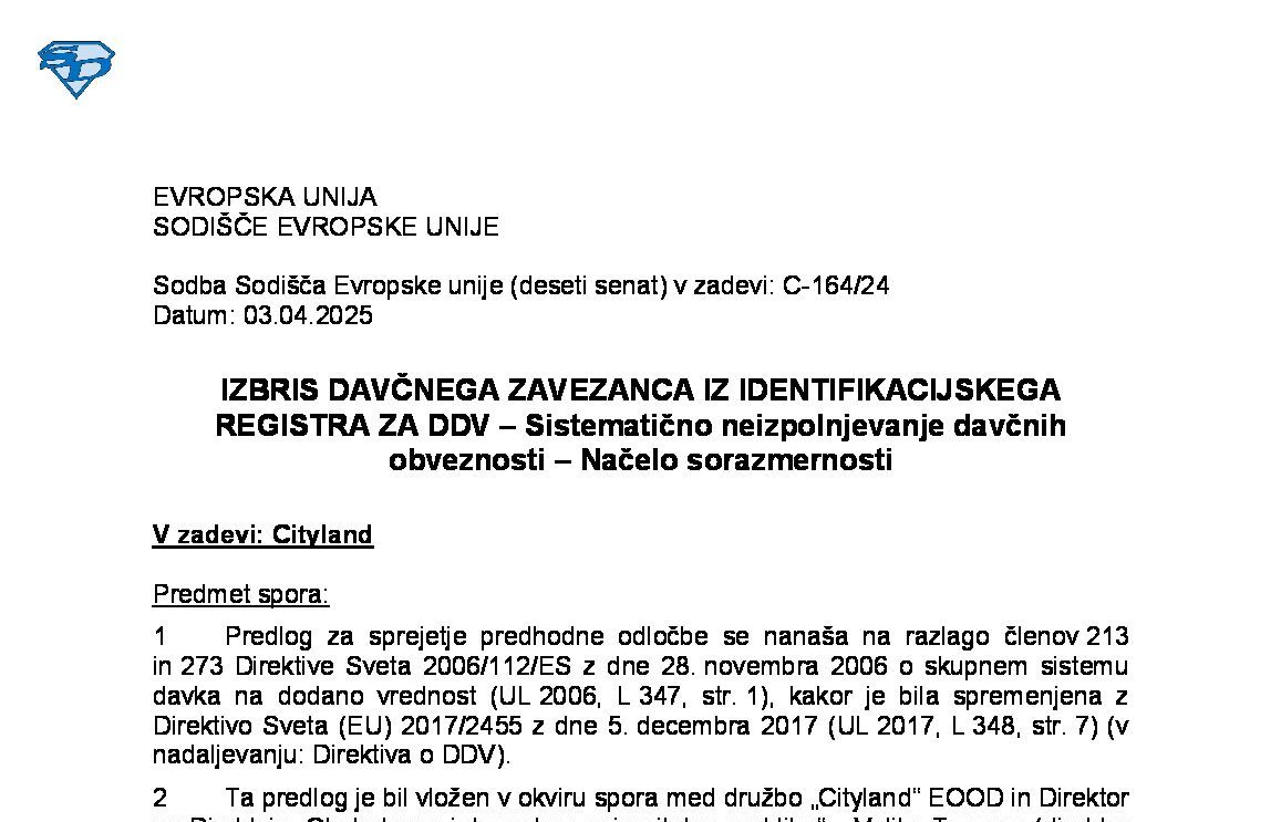 OPROSTITEV V ZVEZI Z DAJANJEM KREDITOV – OPROSTITEV V ZVEZI S FINANČNIMI TRANSAKCIJAMI – IZTERJAVA DOLGOV – Faktoring s prodajo terjatev – Faktoring z zastavno pravico (C-332/24) 23.10.2025 28.10.2025