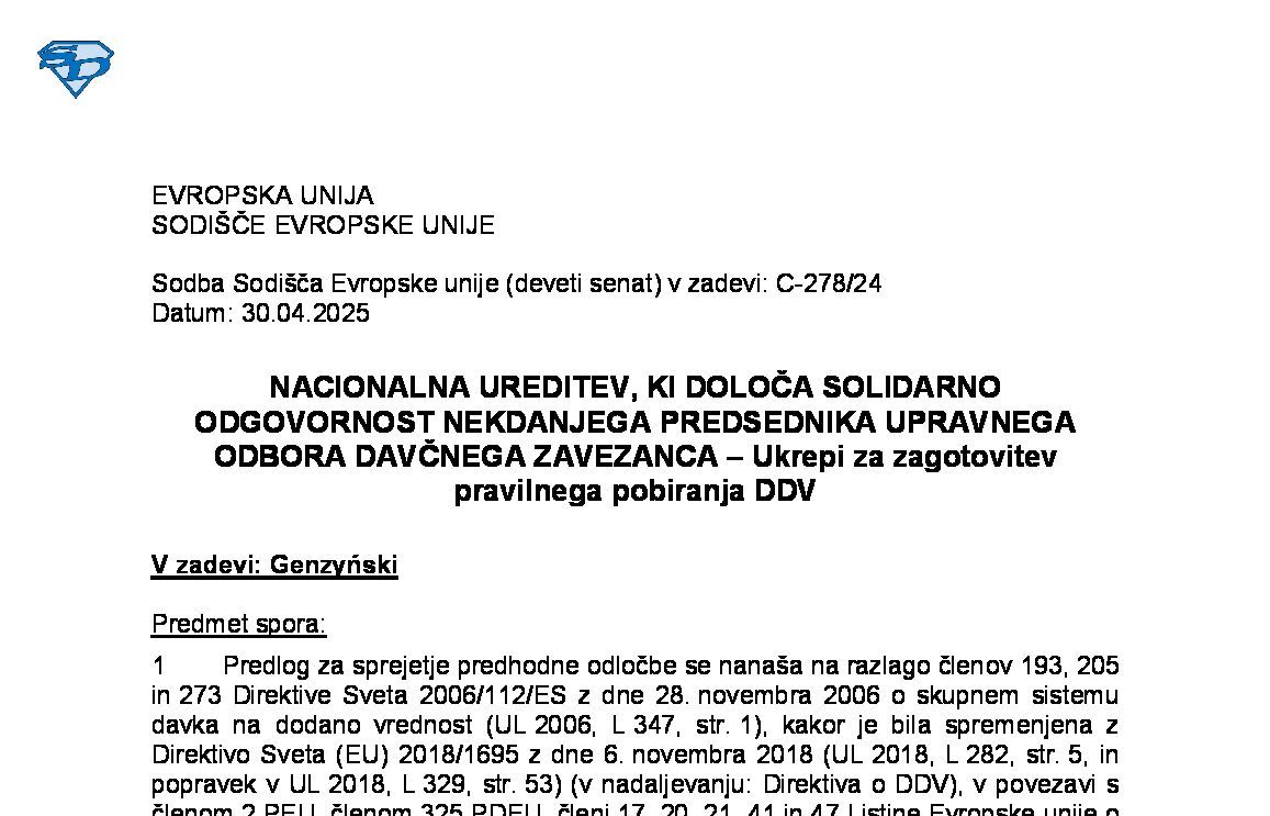 VRAČILO DDV DAVČNIM ZAVEZANCEM, KI NIMAJO SEDEŽA V DRŽAVI ČLANICI VRAČILA – GLAVNA IN POMOŽNA STORITEV – UMETNA DELITEV ENOTNE STORITVE – Neobstoj premestitve predmeta dobave (C-234/24) 23.10.2025 24.10.2025
