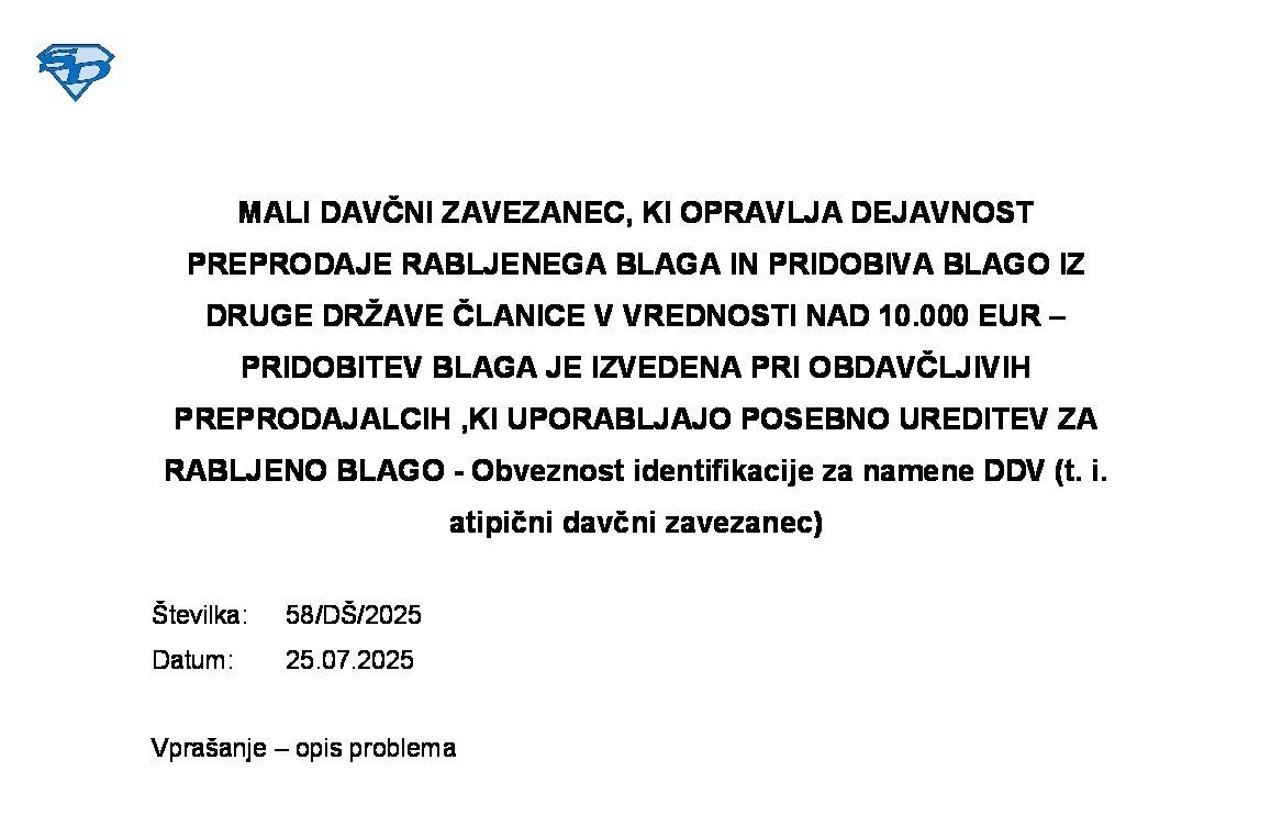 PRIDOBITEV IDENTIFIKACIJSKE ŠTEVILKE ZA DDV PRI MALEM DAVČNEM ZAVEZANCU – NAKUPI RABLJENEGA BLAGA OD OBDAVČLJIVIH PREPRODAJALCEV IZ DRUGIH DRŽAV ČLANIC EU – Ali preseganje nakupov v vrednosti 10.000 EUR pomeni obveznost za identifikacijo za DDV? 27.11.2025 27.11.2025
