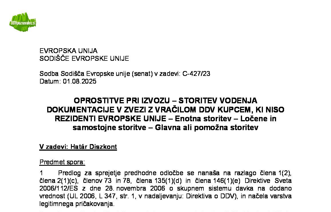 VRAČILO DDV DAVČNIM ZAVEZANCEM, KI NIMAJO SEDEŽA V DRŽAVI ČLANICI VRAČILA – GLAVNA IN POMOŽNA STORITEV – UMETNA DELITEV ENOTNE STORITVE – Neobstoj premestitve predmeta dobave (C-234/24) 23.10.2025 24.10.2025